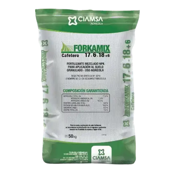 El Fertilizante para café Forkamix 17-6-18+6 de Ciamsa es una mezcla física de alto desempeño formulada para cubrir las necesidades nutricionales específicas del cultivo de café. Su balance 17-6-18 aporta nitrógeno, fósforo y potasio en proporciones ideales para estimular un crecimiento vigoroso, favorecer la formación de follaje saludable y mejorar el llenado del fruto en etapas productivas.