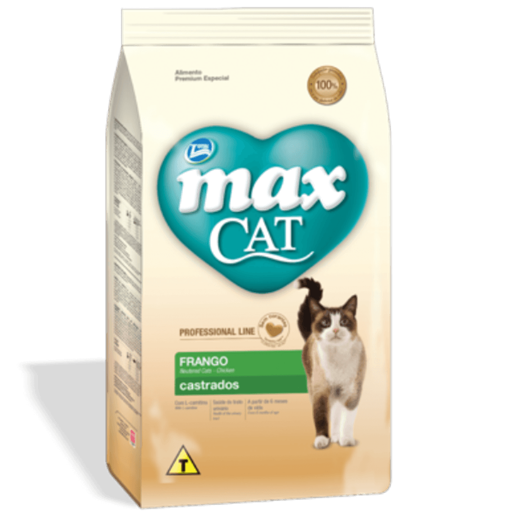 Max Cat Castrado ayuda a controlar el peso, refuerza la salud urinaria y digestiva en gatos esterilizados, con L-carnitina y sin colorantes.