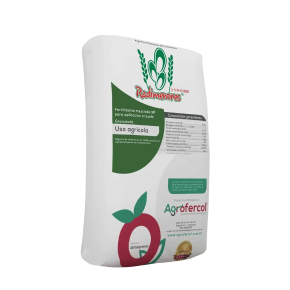 El Fertilizante Radimenores es un producto edáfico de aplicación radicular formulado para fortalecer la base del cultivo y mejorar la eficiencia en la absorción de nutrientes. Su composición aporta elementos esenciales como nitrógeno (N) y fósforo (P), fundamentales para el desarrollo vegetativo, la formación de raíces fuertes y un crecimiento inicial vigoroso.